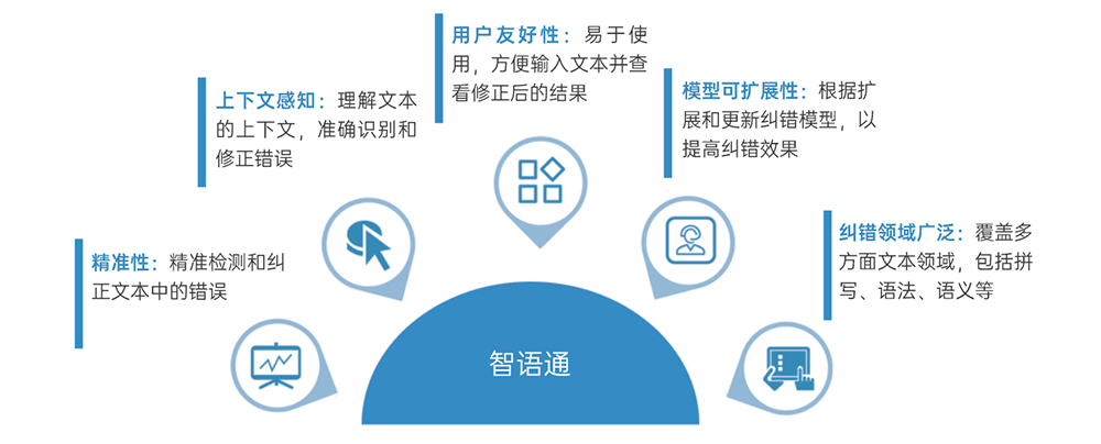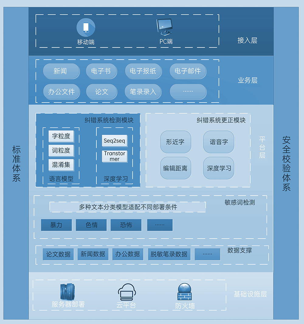 欣誠智語通-文本糾錯檢測系統檢測模塊包含語言模型和深度學習模型組成,語言模型主要從字粒度、詞粒度、混淆集進行錯誤檢測,深度學習模型由seq2seq序列模型和強大的上下文信息處理能力的transformer模型組成。糾錯模塊通過形近字、諧音字、深度學習等方式完成文本糾錯功能。論文數據、新聞稿件數據、筆錄數據等行業數據做為模型訓練支撐。