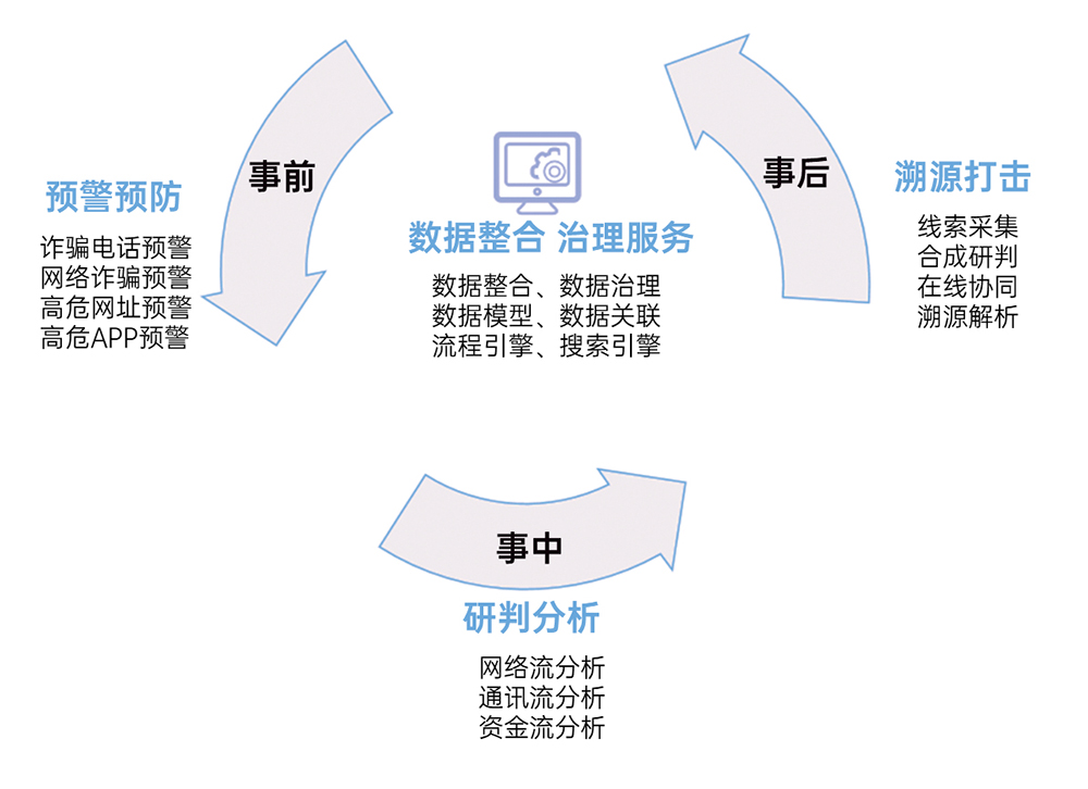反詐聯合實驗室建設以打擊治理電信網絡詐騙犯罪及所有涉網犯罪為核心,實驗室采用警企合作,發揮各自能力優勢,構建反詐環境。以“兩升兩降”為目標,開展研究實驗,尋找有效途徑,加強AI模型建設,線索預警智能化,摸索辦案過程,工作機制體系化,多源數據融合,分析研判深入化,找尋深挖尋蹤方法,窩點溯源精確化,提升數據展現能力,業務態勢可視化。